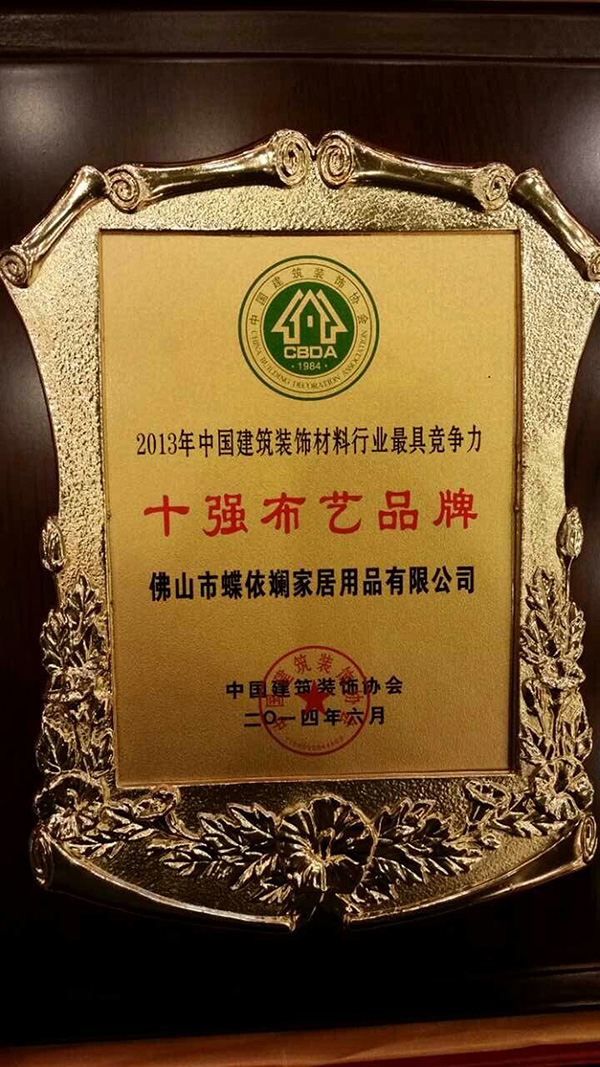 2014年6月10—11日,由中國建筑裝飾協(xié)會(huì)主辦、中國建筑裝飾協(xié)會(huì)材料委會(huì)員承辦的首屆中國建材家居產(chǎn)業(yè)發(fā)展大會(huì)在北京國際會(huì)議中心舉行。大會(huì)發(fā)布了國內(nèi)首部《2013年中國建材家居產(chǎn)業(yè)發(fā)展報(bào)告》,并對(duì)全國建筑裝飾材料百強(qiáng)企業(yè),行業(yè)十強(qiáng)品牌進(jìn)行了頒獎(jiǎng),佛山市蝶依斕家居用品有限公司旗下品牌“蝶依斕”榮獲十強(qiáng)布藝品牌殊榮。