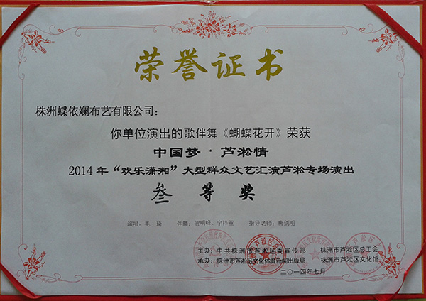 7月27日下午,由中共株洲市蘆淞區(qū)委宣傳部、區(qū)總工會(huì)主辦,區(qū)文體新局、區(qū)文化館承辦,新蘆淞集團(tuán)、中航工業(yè)南方、蝶依斕布藝專家等單位支持的“中國(guó)夢(mèng)·蘆淞情”——2014年“歡樂瀟湘”大型群眾文藝匯演蘆淞區(qū)專場(chǎng)在株洲市環(huán)洲歌劇院隆重開演。由株洲蝶依斕布藝有限公司選送的歌伴舞《蝴蝶花開》榮獲三等獎(jiǎng)。