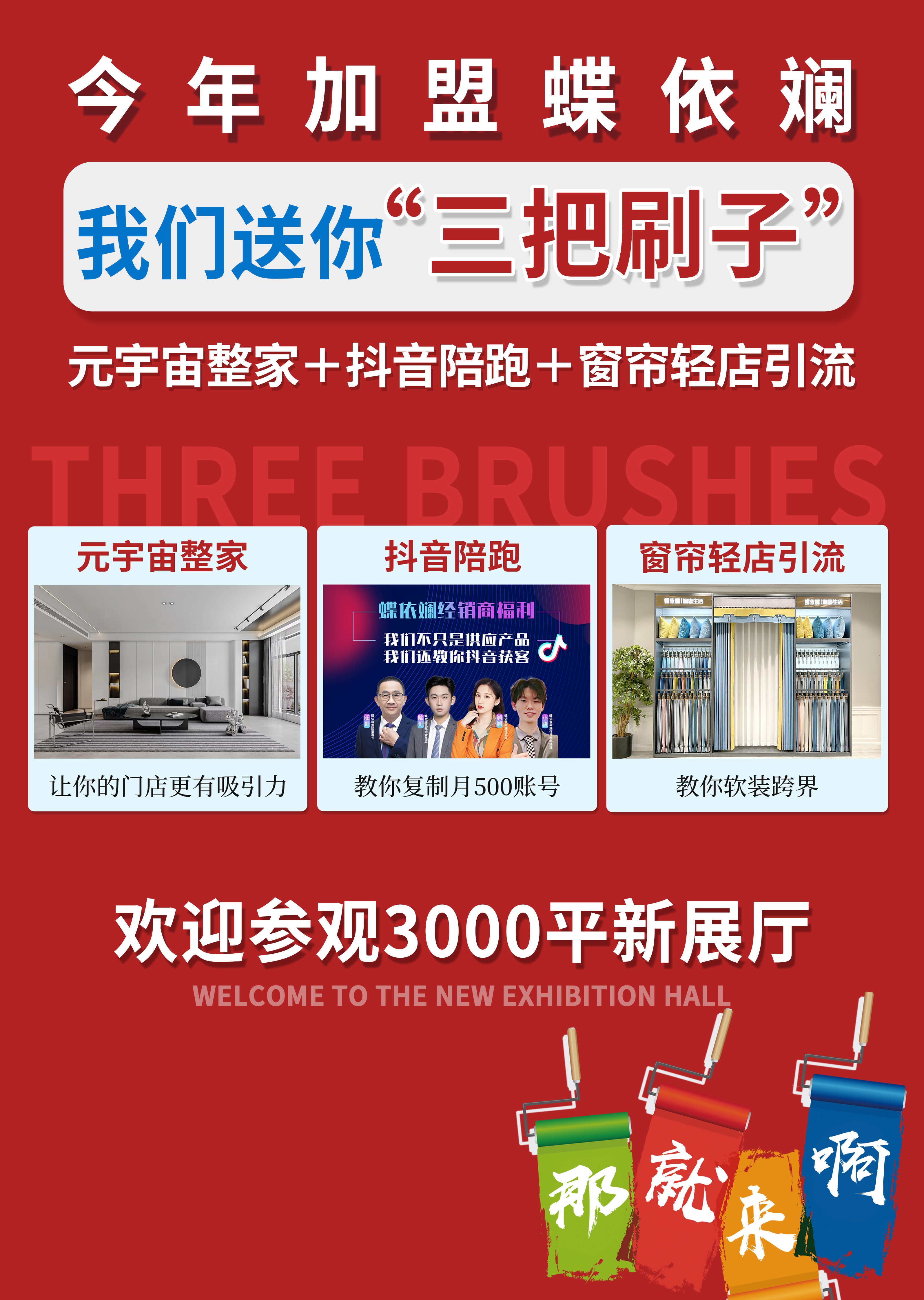 創(chuàng)立29年,蝶依斕緊跟時(shí)代,向內(nèi)蓄力,向外破局,專注于沙發(fā)、窗簾、軟床/床墊等整家家居產(chǎn)品研發(fā)及全案軟裝服務(wù)升級(jí)。現(xiàn)全國(guó)300多家專賣店,600多家“魔法窗簾輕店”,1000多家經(jīng)銷商,2022年,蝶依斕入選“國(guó)家高新技術(shù)企業(yè)”、“國(guó)家級(jí)科技型中小企業(yè)”。多把“刷子”加持下,將助力更多合作伙伴在創(chuàng)富路上奪得先機(jī),跑出“加速度”。