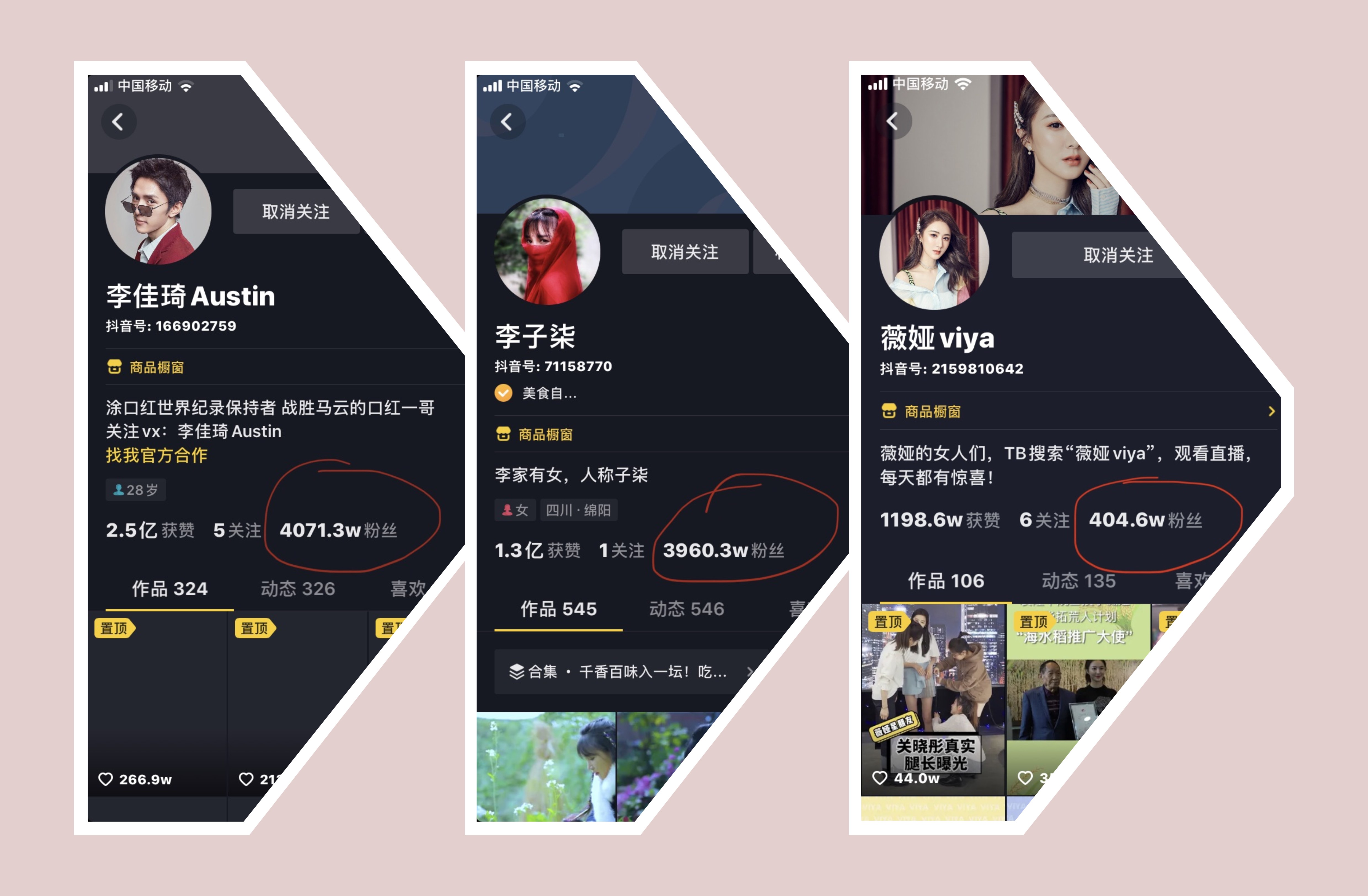 抖音主賬號(hào):李佳琦4071W、李子柒3960W、薇婭404W