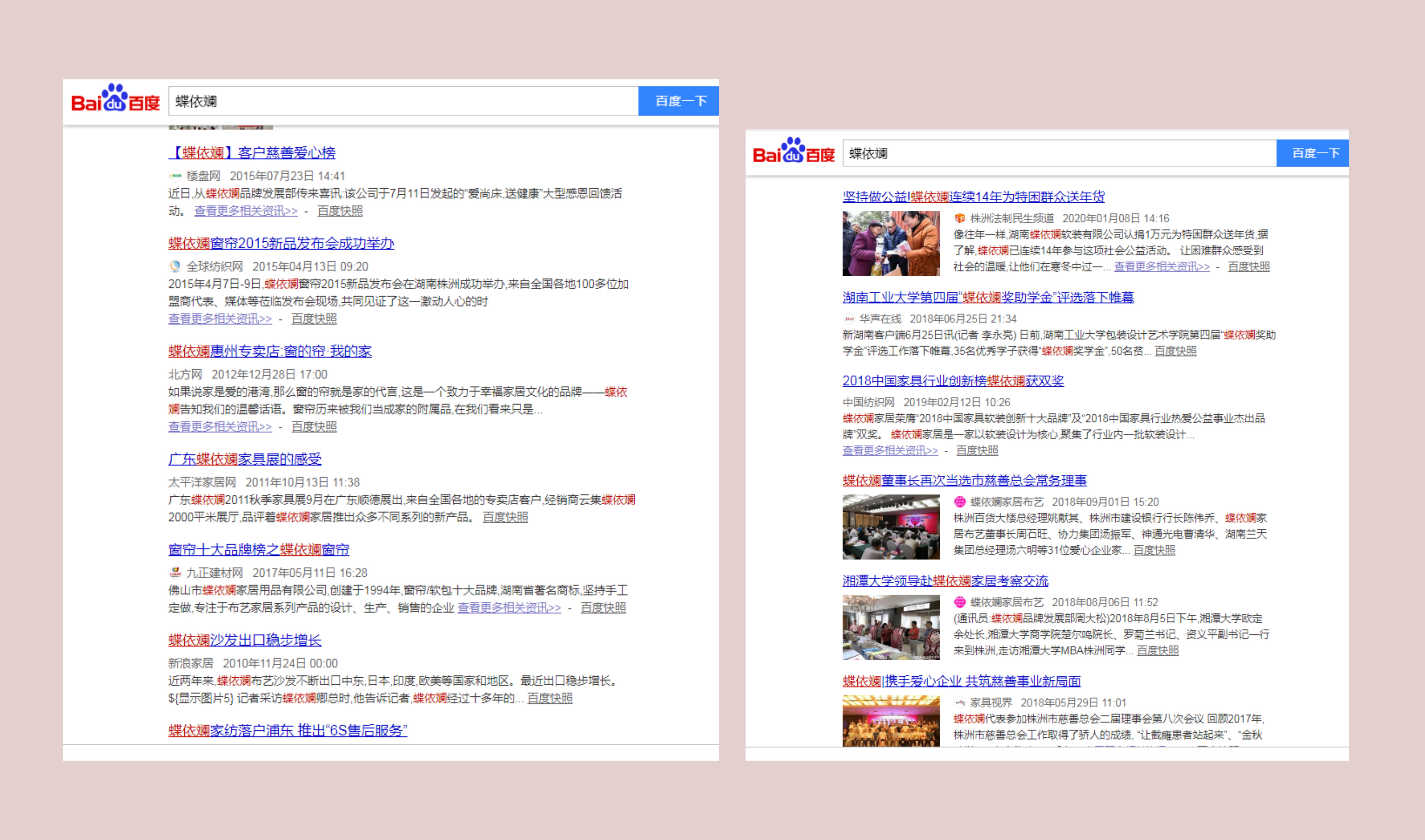 首先我們必須根據(jù)客戶的核心需求來(lái)給自己定位,我能為客戶解決什么問(wèn)題,客戶為什么要選擇我?這就是我們的品牌slogan。我們蝶依斕的品牌slogan就是“搭配更好看,我選蝶依斕”。有了品牌slogan,客戶在選擇你之前,他憑什相信你呢?這就要求我們必須打造我們的品牌IP。不管是軟裝門(mén)店還是軟裝個(gè)人工作室,都是一件繞不開(kāi)的事情。蝶依斕在品牌IP打造上,可以說(shuō)完全得益于互聯(lián)網(wǎng)?;ヂ?lián)網(wǎng)時(shí)代的客戶想要了解你,首先會(huì)去搜索你,他們常用工具就是“度娘”。大家可以模仿用戶,在百度上搜索“蝶依斕”三個(gè)字,我們可以看到,PC端會(huì)顯示68萬(wàn)多條搜索結(jié)果,百度認(rèn)證的官網(wǎng)、百度百科、百度視頻、百度圖片、百度資訊、百度地圖、百度貼吧等等,海量的內(nèi)容全部是我們公司的信息,沒(méi)有一個(gè)缺項(xiàng),也沒(méi)有一個(gè)別人的信息。