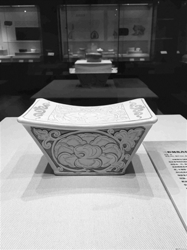 在廣州西漢南越王墓博物館展出的第87號(hào)瓷枕上,枕面中央刻有:峰前明月照藤床,窗內(nèi)清風(fēng)生石枕。