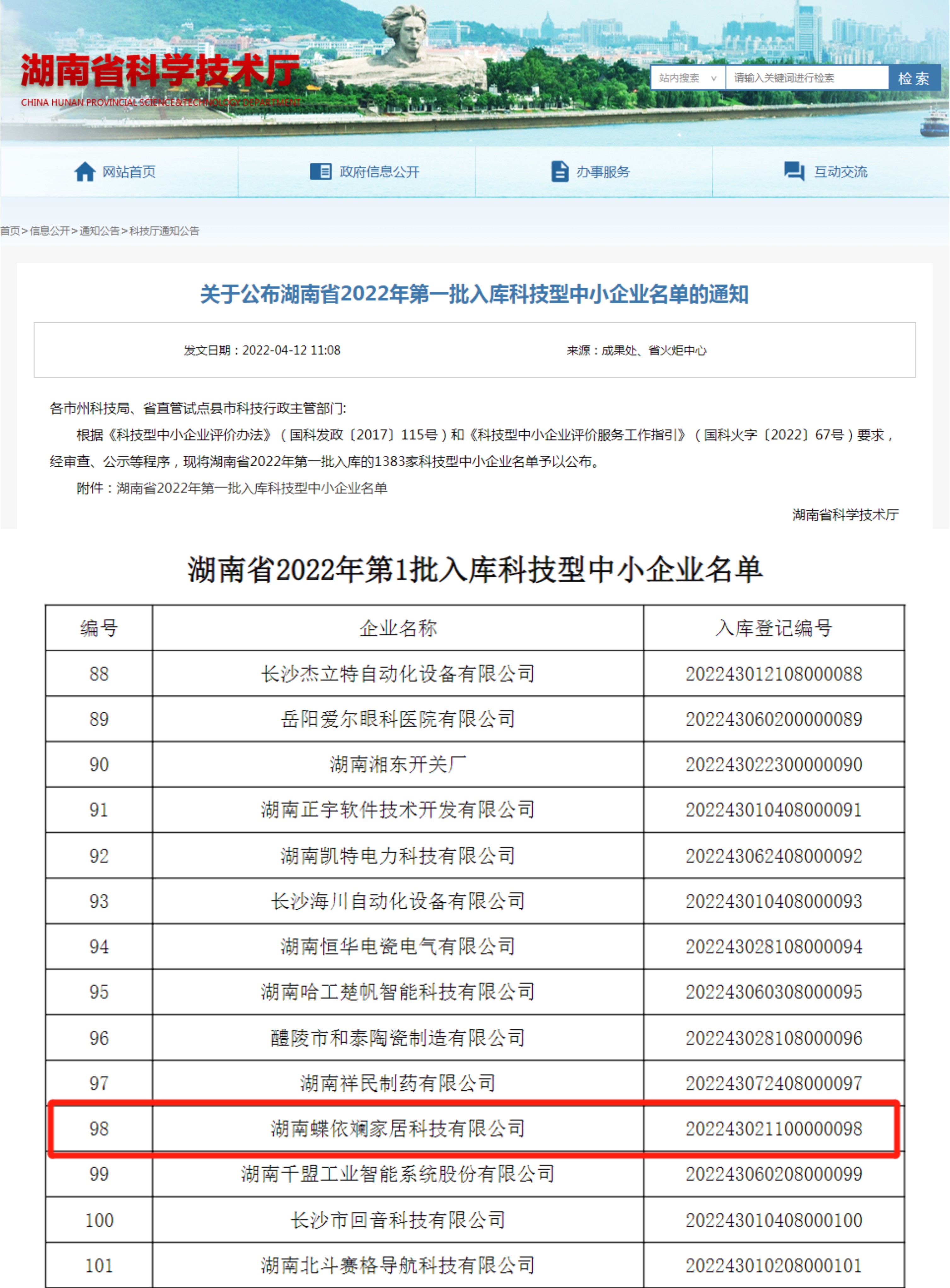 近日,湖南省科技廳公示了2022年第1批入庫國家級(jí)科技型中小企業(yè)名單,蝶依斕家居成功入選。