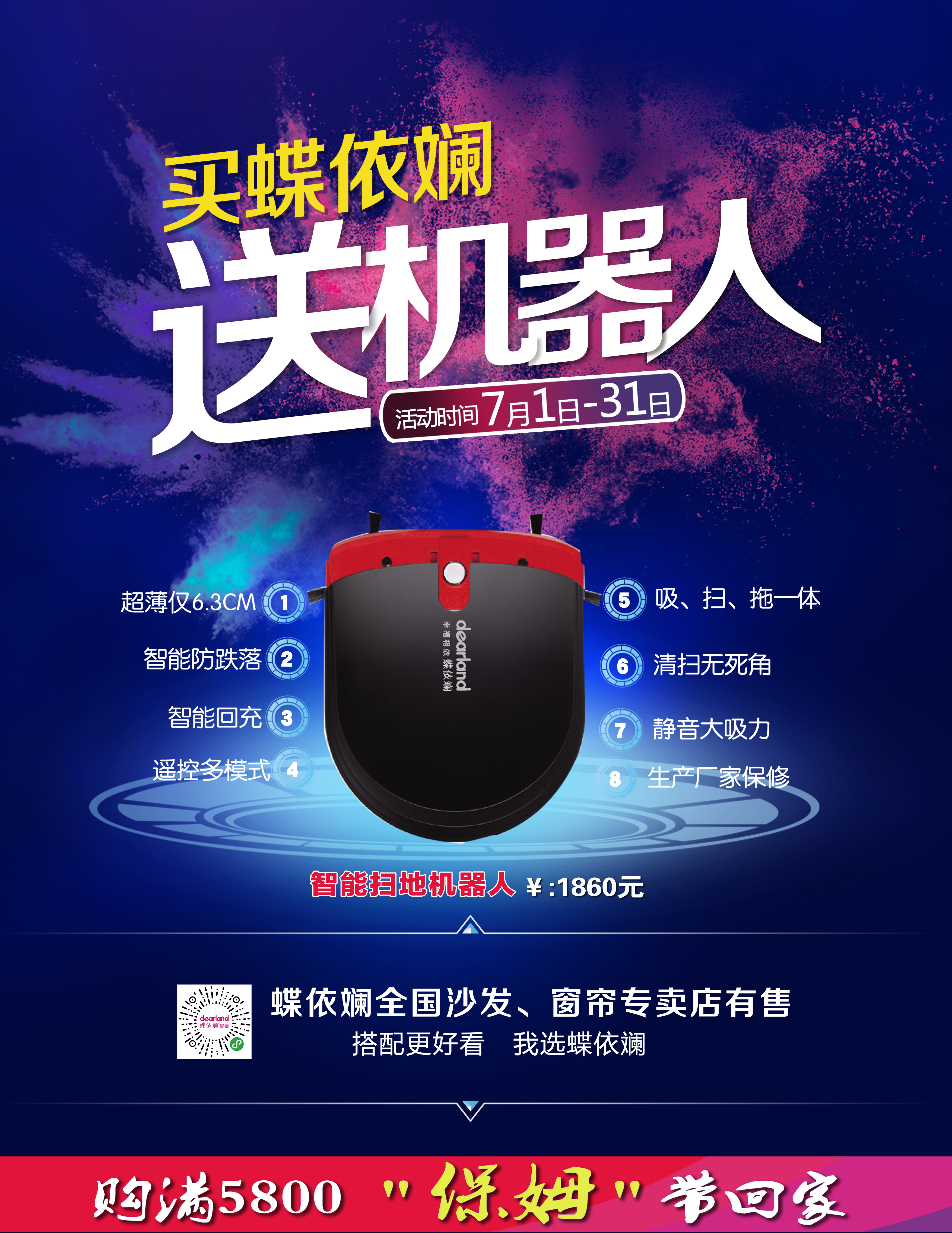 7月1日-31日,只要在蝶依斕天貓、京東或全國(guó)各地200多家專(zhuān)賣(mài)店,購(gòu)買(mǎi)蝶依斕沙發(fā)、窗簾產(chǎn)品滿(mǎn)5800元,1860元的超薄智能掃地機(jī)器人就送你了。